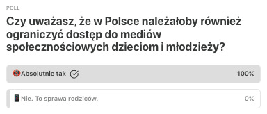 W naszej ostatniej ankiecie, dotyczącej wprowadzonych w Danii i innych krajach ograniczeń w dostępie do mediów społecznościowych dla dzieci i młodziezy, 100% ankietowanych opowiedziało się za wprowadzeniem podobnych przepisów również w Polsce ❗️
