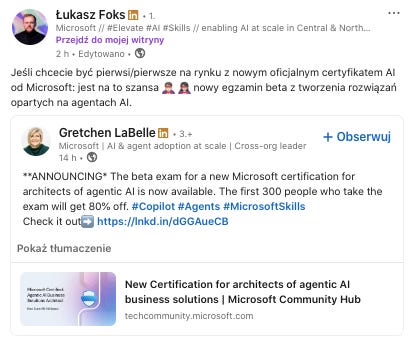 Tymczasem inny gigant zaprasza do certyfikacji umiejętności AI. Egzamin pozwala uzyskać certyfikat AI z rozwiązań opartych na Agentch AI:
