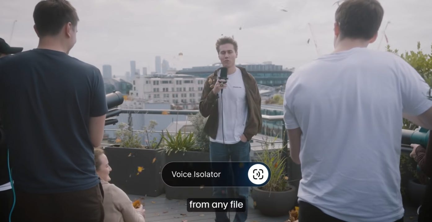 ElevenLabs Voice Isolator dla nagrań wideo. Dzięki Voice Isolator możesz przesłać dowolny plik i automatycznie usunąć szumy tła, takie jak rozmowy, muzyka, lub hałas uliczny. Dane wyjściowe zachowują ten sam format.