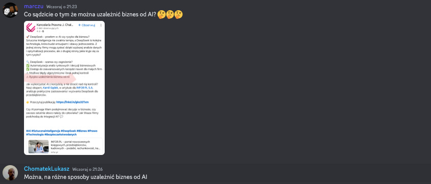 Dziś w dziale AI w biznesie poruszony został wątek: “Ryzyko uzależnienia biznesu od AI”. Czym grozi, jak się objawia i jak tak naprawdę to rozumieć. Próbujemy to właśnie rozgryźć. Zaintrygowany? Dołącz do dyskusji na tym kanale na naszym Discordzie.
