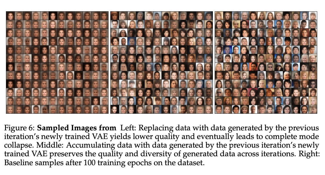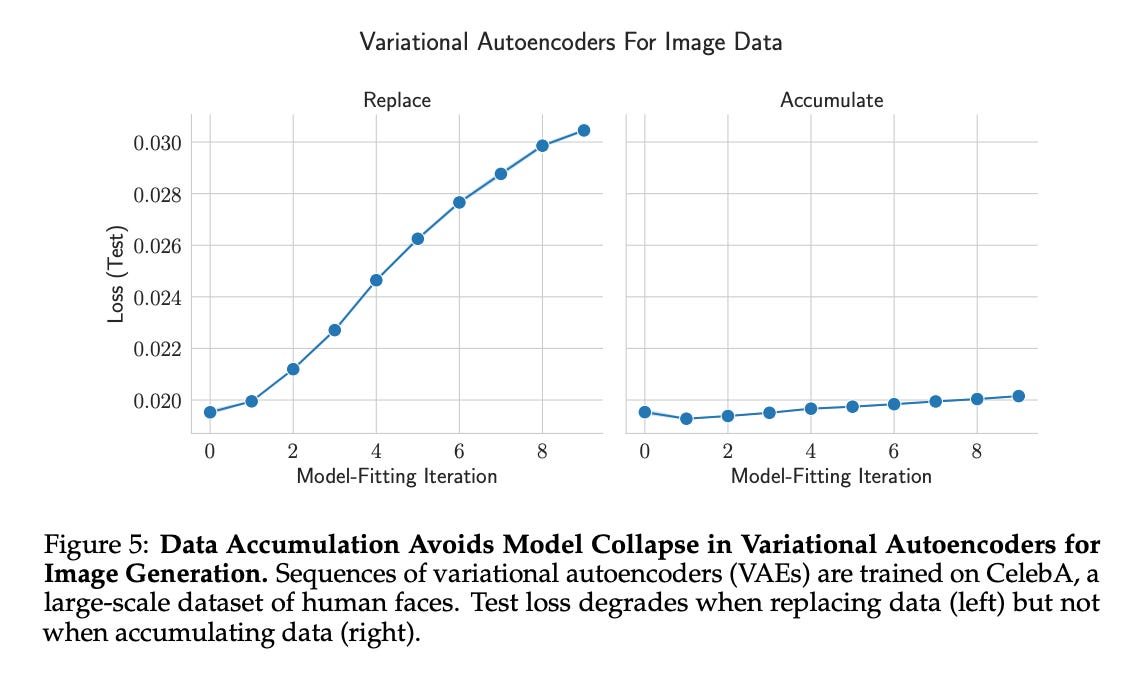 Przykład z generowania obrazów (CelebA): badacze trenowali łańcuch modeli generatywnych na zdjęciach twarzy. Gdy w każdej rundzie treningu zastępowali oryginalne zdjęcia tymi wygenerowanymi przez poprzedni model, po kilku iteracjach twarze zaczęły wyglądać niemal tak samo, model produkował kilka bardzo podobnych typów twarzy i gubił resztę różnorodności. To przypadek model collapse (model zawęża się do kilku wzorców i ignoruje resztę). Gdy zamiast zastępować dane je akumulowano (dokładano syntetyczne dane do tych prawdziwych, stworzonych przez człowieka), różnorodność i jakość pozostały stabilne (czyli na nowych, niewidzianych zdjęciach model nie radził sobie gorzej z każdą kolejną rundą).