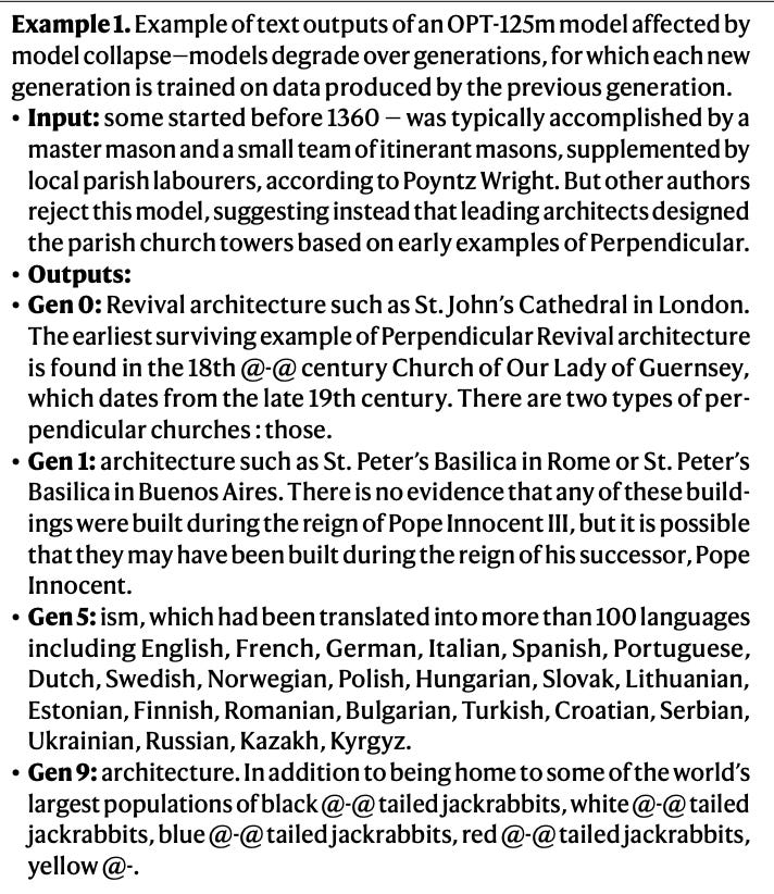 W tekście zjawisko bywa jeszcze bardziej zdradliwe: model nie bredzi od razu, tylko zaczyna pisać coraz bardziej uśrednione rzeczy. Różnorodność leksykalna, składniowa i semantyczna spada z rundy treningu na trening modelu, a później przy uczeniu na danych wygenerowanych przez AI mogą pojawiać się już kompletne bzdury (przykład z OPT-125M w sekcji “Model Collapse”: prompt o architekturze → po kilku generacjach wywód o zającach z kolorowymi ogonami).