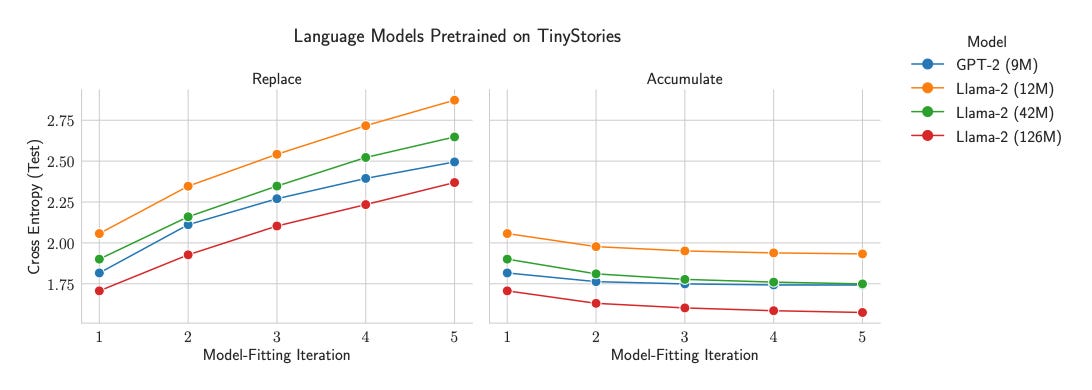 Kolejne generacje stają się coraz bardziej przewidywalne i podobne do siebie, a różnorodność słów, składni i znaczeń systematycznie maleje, co pokazano w badaniach nad treningiem na tekście syntetycznym.