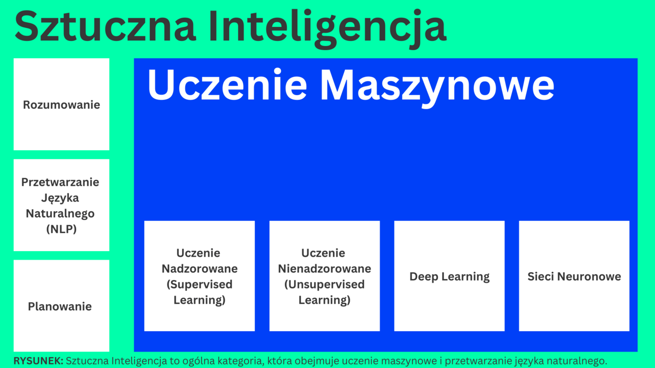Uczenie Nadzorowane: algorytmy uczą się na podstawie danych treningowych z etykietami, aby przewidywać wyniki dla nowych danych.