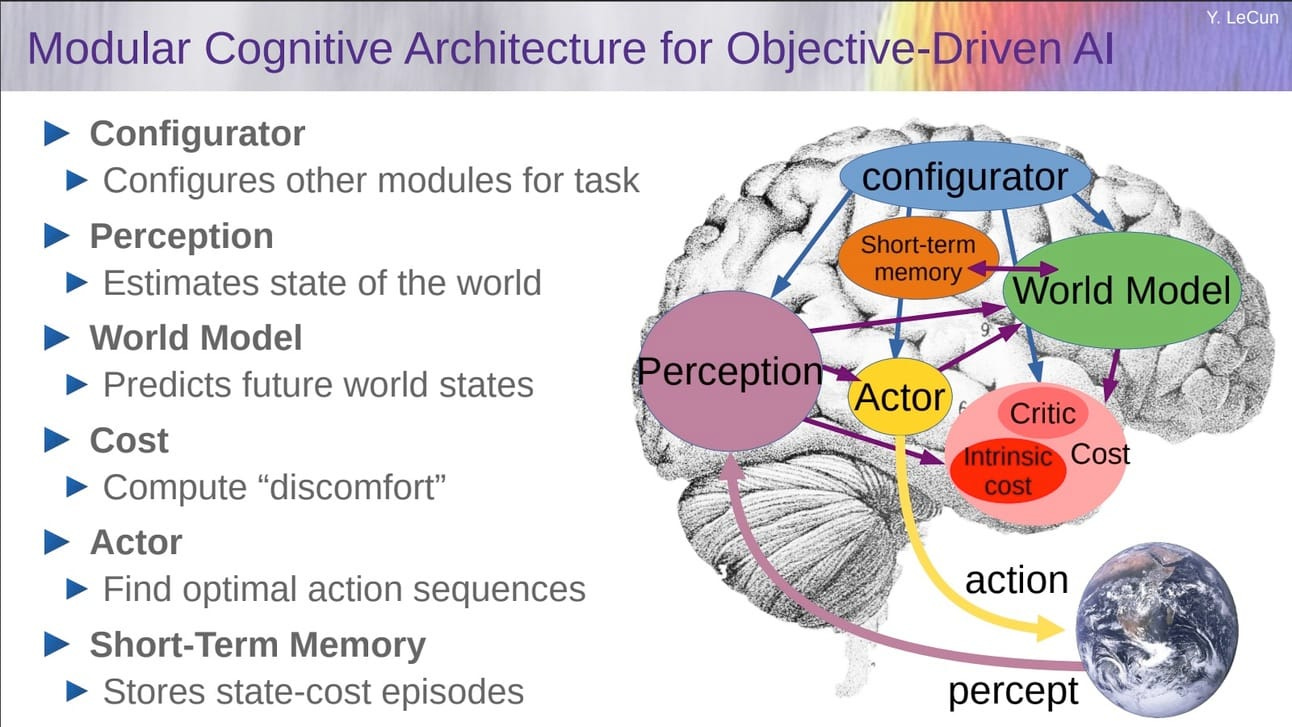 LeCun dąży do stworzenia architektury AI, która integruje różne moduły poznawcze, współpracujące ze sobą w celu osiągnięcia określonych celów. Kluczowe elementy tej architektury to: