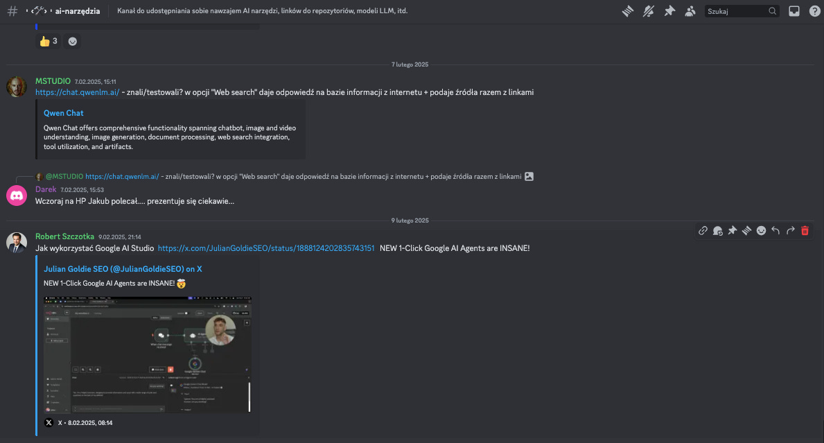 Kiedy to czytasz, na naszym Discordzie debatuje społeczność. Rozmawiamy o AI, polecamy narzędzia, a przepływ informacji, w tym najświeższych newsów, jest jak rwący potok. W niektóre dni potrafi być tam naprawdę gwarno. Warto zaglądać, bo tam właśnie tętni newsroom AI, z którego później czerpiemy. Społeczność to także miejsce gdzie uczymy się od siebie wzajemnie. Warto być w tej ekipie 👇🏻 to na Discordzie bije serce horyzontu: