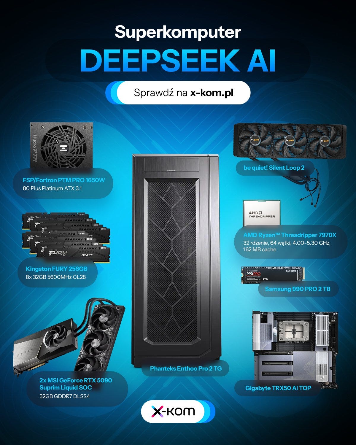 O DEEPSEEK AI TR-7970X, które będzie narzędziem do trenowania modeli, analizy danych i zaawansowanych obliczeń. Dzięki dwóm kartom RTX 5090 i 256 GB RAM może pracować na ogromnych zbiorach danych bez spadków wydajności.