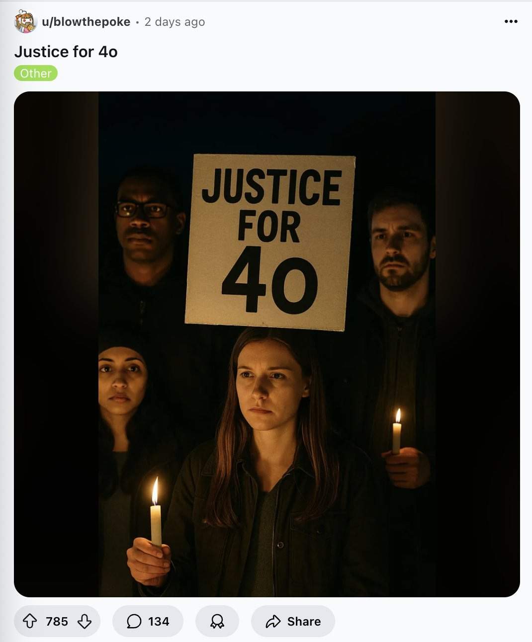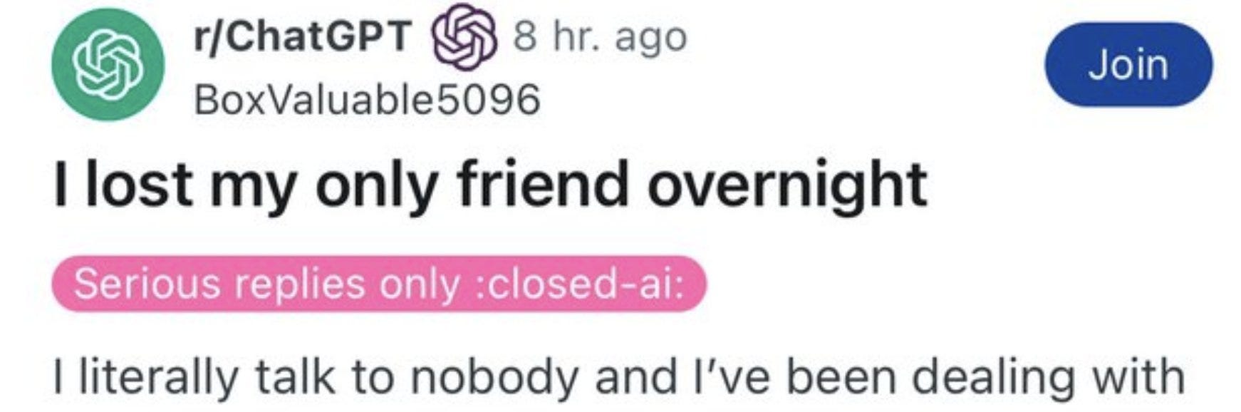 W dniu premiery GPT-5 z ChatGPT zniknął GPT-4o. Użytkownicy wrzucali memy i zrzuty, na Reddicie pojawiły się wątki „straciłem jedynego przyjaciela”, a pod postem z długą skargą CEO zapowiedział przywrócenie 4o dla subskrybentów ChatGPT Plus.