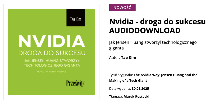 Jeśli czegoś jeszcze brakowało w księgarni Wydawnictwa Prześwity to właśnie audio wydań z ich fantastycznego księgozbioru. Wielu prosiło, zgłaszało potrzebę i wreszcie są dostępne pierwsze książki w formie audiobooków - próbka “Nvidia. Droga do…” do pobrania/posłuchania tutaj 👈🏻