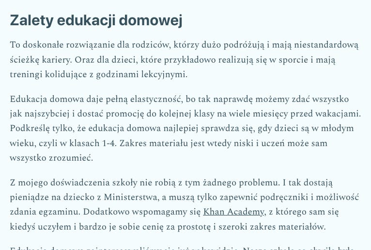 Nie wiecie jednak, że myślimy z żoną także nad edukacją domową, bo wychowuję dzieci również poprzez sport. O ile zdrowie pozwoli, zmierzać będziemy bowiem w stronę profesjonalizacji zawodniczej, więc tradycyjna ścieżka szkolna będzie problemem. I w związku z tym przyglądam się czemuś na wzór szkoły w chmurze, ale sporo czytam także o innych, bardziej tradycyjnych rozwiązaniach - pisze o tym choćby Przemek Gerschmann u siebie w 52 notatkach, które bardzo serdecznie Wam polecam: