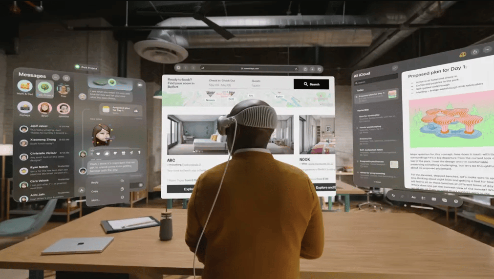 Widzisz tego gościa na fotografii? Włożył sobie na głowę Vision Pro i smaży sobie mózg. Nie żartuję, naprawdę to robi. Dokładnie rzecz ujmując, zaburza funkcje poznawcze. Widać, że odpisuje na wiadomości, bookuje hotel i analizuje plan dnia. Cztery ekrany bezpośrednio przed oczami.