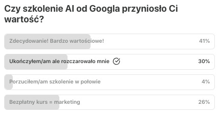 Na Google spadła wielka krytyka. Tak przynajmniej interpretuję dyskusję o kursie “Umiejętności jutra 2.0”. Nie odzwierciedla tego przekonująco ankieta sprzed tygodnia, ale na X czy LinkedIn wybrzmiewa coś w rodzaju rozczarowania. Szkolenie stało się wartościowe tak naprawdę tylko dla początkujących, brak w nim szerszego spojrzenia na AI poza infrastrukturę Google oraz brak w kursie mięsa, które faktycznie mogłoby zmienić później organizację, w której pracuje absolwent. W porównaniu do edycji poświęconej marketingowi, tej sprzed kilku lat, kurs o AI nie jest już tak wartościowy,, przez co certyfikat ukończenia nieco się zdewaluował. Być może warto go mieć, ale…