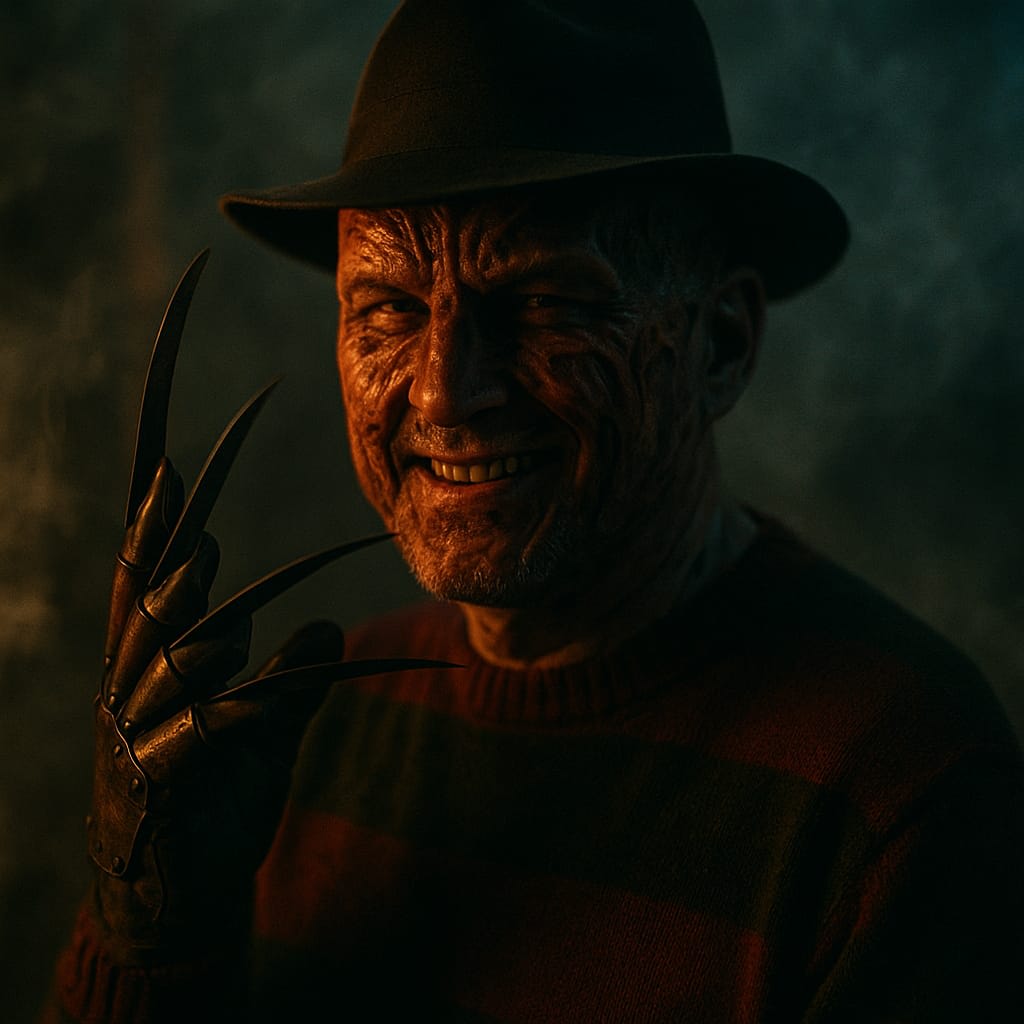 “cinematic portrait of Freddy Krueger, burned and scarred face, iconic brown fedora, striped red and green sweater, metal claw glove raised near his face, menacing grin under dim light, smoke and steam around, horror atmosphere, ultra-realistic texture and skin detail, cinematic chiaroscuro lighting, shallow depth of field, captured with ARRI Alexa Mini LF, Cooke Anamorphic/i 50mm lens, ISO 400, f/1.4, 1/48 shutter, 3200K tungsten white balance, 24fps motion blur, soft film grain, dark cinematic color grading, 1980s horror aesthetic, backlit haze, dramatic rim lighting highlighting silhouette, shot on Kodak Vision3 500T film, --ar 3:2 --v 6 --style cinematic --q 2”
